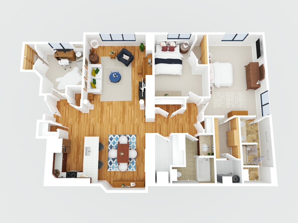 For currently vacant properties we will virtually furnish the 3D plan so buyers can evaluate the potential of their future home. We will add beds in bedrooms, a sofa in a living room, a dining table set in a dining room, etc… We will not be able to take specific requests in regards to the style and placement of the virtual furniture.